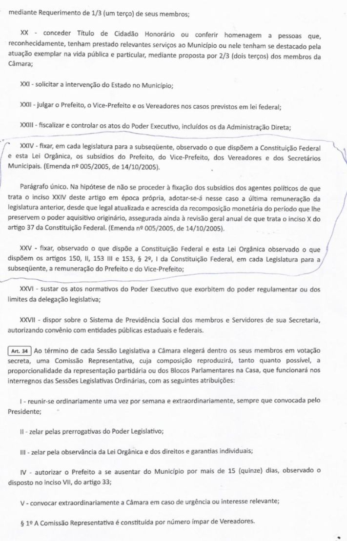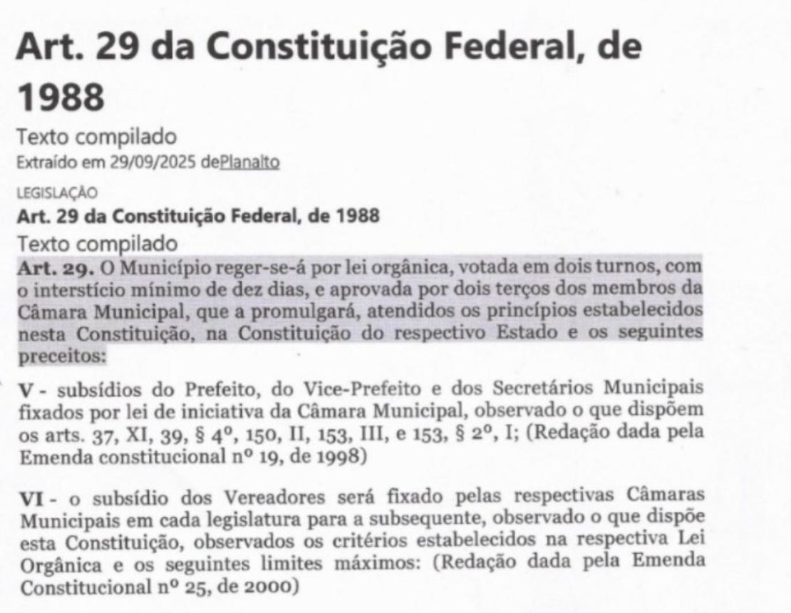 O novo texto removeu a expressão “em cada legislatura para a subsequente” do inciso que tratava dos subsídios do prefeito, do vice e dos secretários. Com isso, o texto passou a dizer apenas que os subsídios seriam “fixados por lei de iniciativa da Câmara Municipal” — sem deixar claro que o aumento só poderia valer para o próximo mandato.