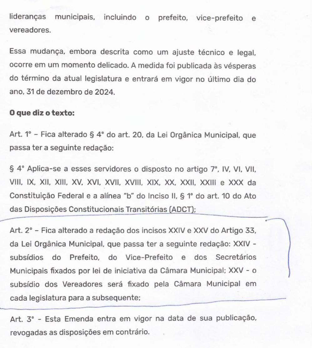 A mudança, publicada oficialmente em 31 de dezembro de 2024, entrou em vigor imediatamente e permitiu que, em janeiro de 2025, fosse votada a lei que reajustou os salários do prefeito e do vice, gerando aumento de mais de R$ 13 mil para o chefe do Executivo.